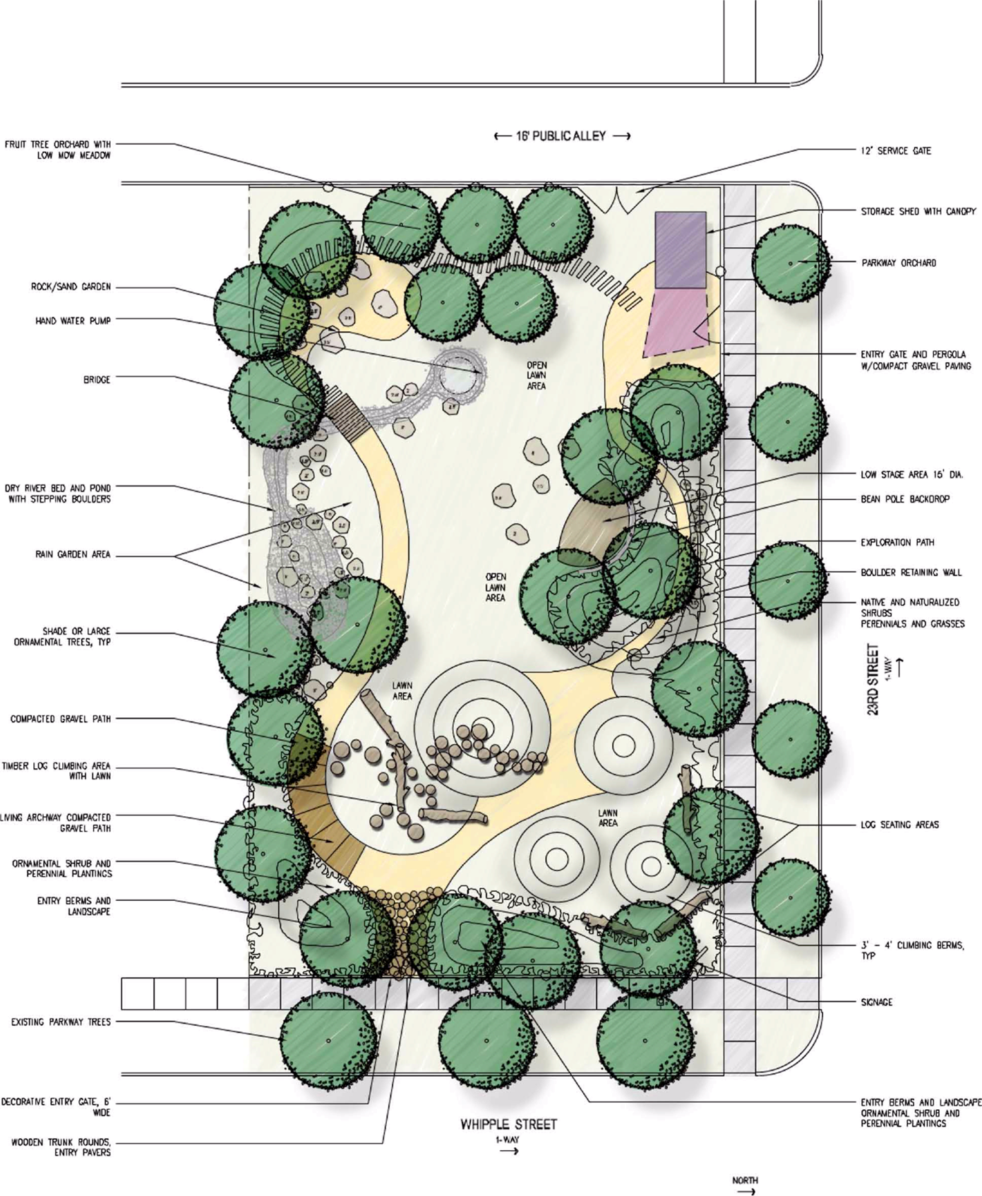 There is a shortage of open spaces for families and children to enjoy the outdoors in Little Village. Working with the community through NeighborSpace, CG|LS is helping to create a place where young people can explore nature and experience play through a non-traditional playground design called a Play Garden. Rather than swings and slides, there will be earthen mounds, balancing logs, living tunnels, climbing sculptures, boulders, butterfly, rain and edible gardens.