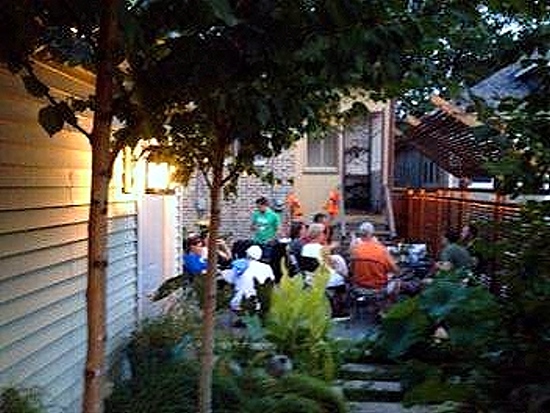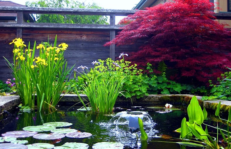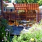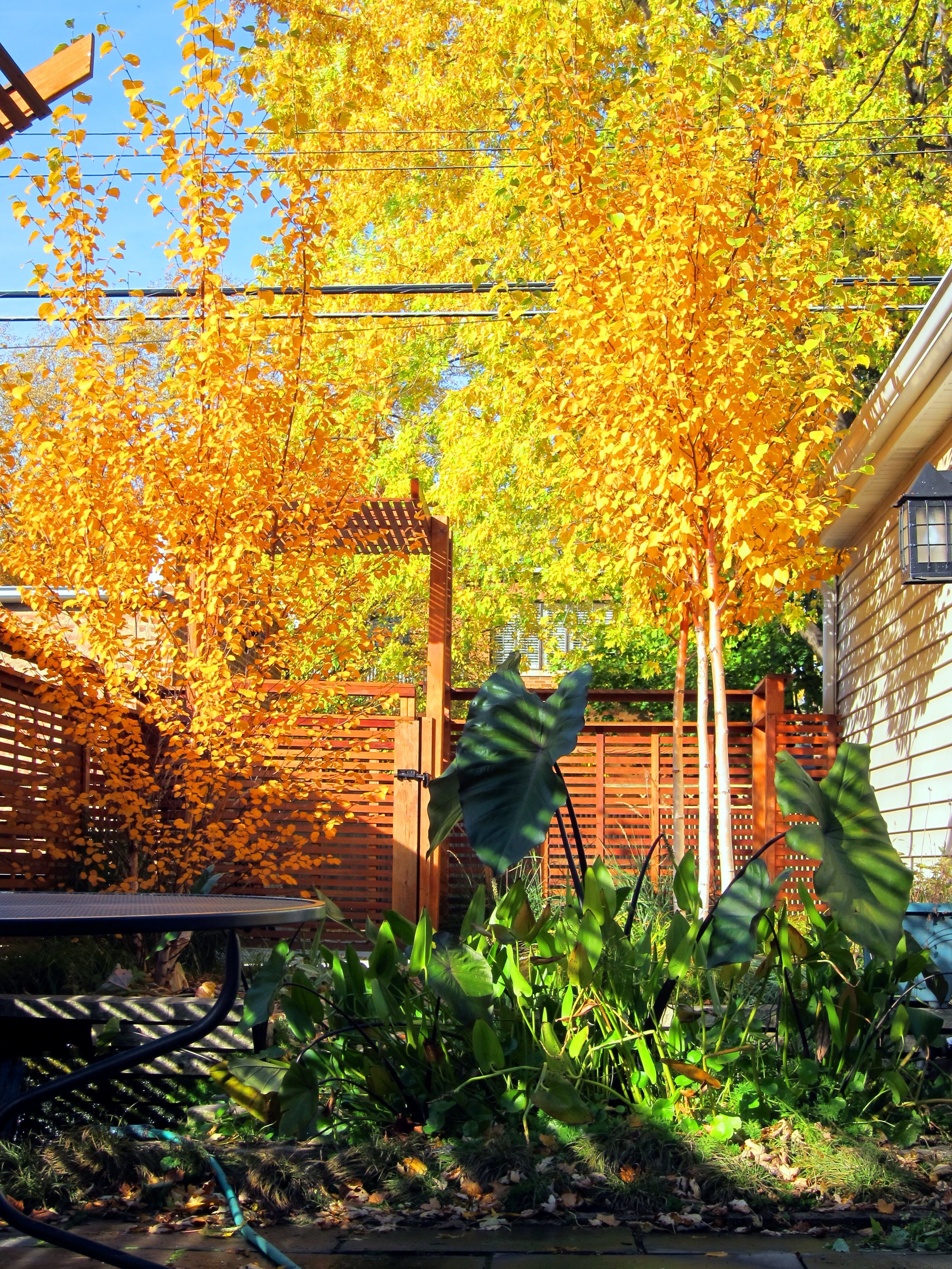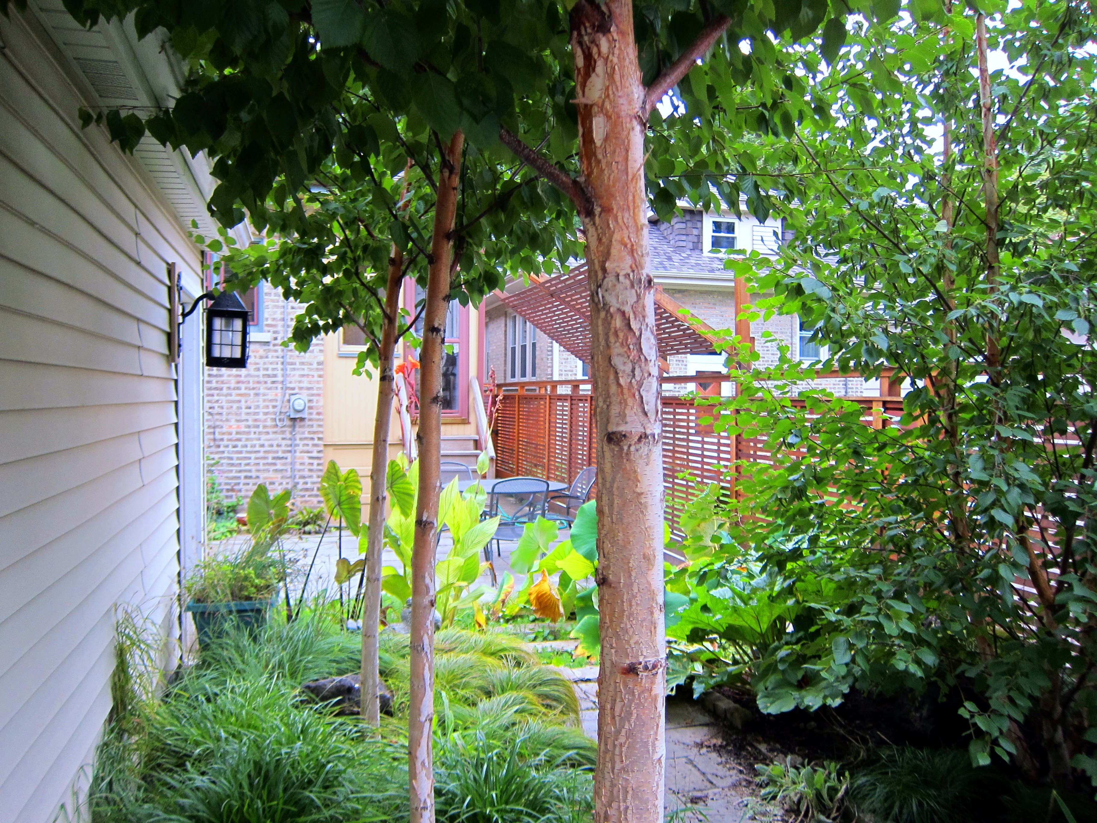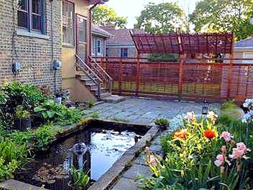 The ponds are home to goldfish and frogs, and support a variety of colorful Water Lilies, Iris, and other aquatic plants. A mix of perennials, and ornamental grasses attract butterflies and bees, and provide year-round seasonal interest. A dense Birch grove under planted with a variety of Sedges and ephemeral native spring flowers separates the patio from the alley.