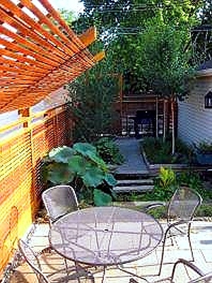The yard is divided into three zones: entertainment, privacy, and garden. A simple palette of bluestone, limestone, and cedar is incorporated to unify the zones. The entertainment area, located off the back porch, is defined by two ponds and lush landscape. A custom cedar-slate fence with a trellis canopy provides privacy and shade. Integrated lighting provides a nighttime accent.