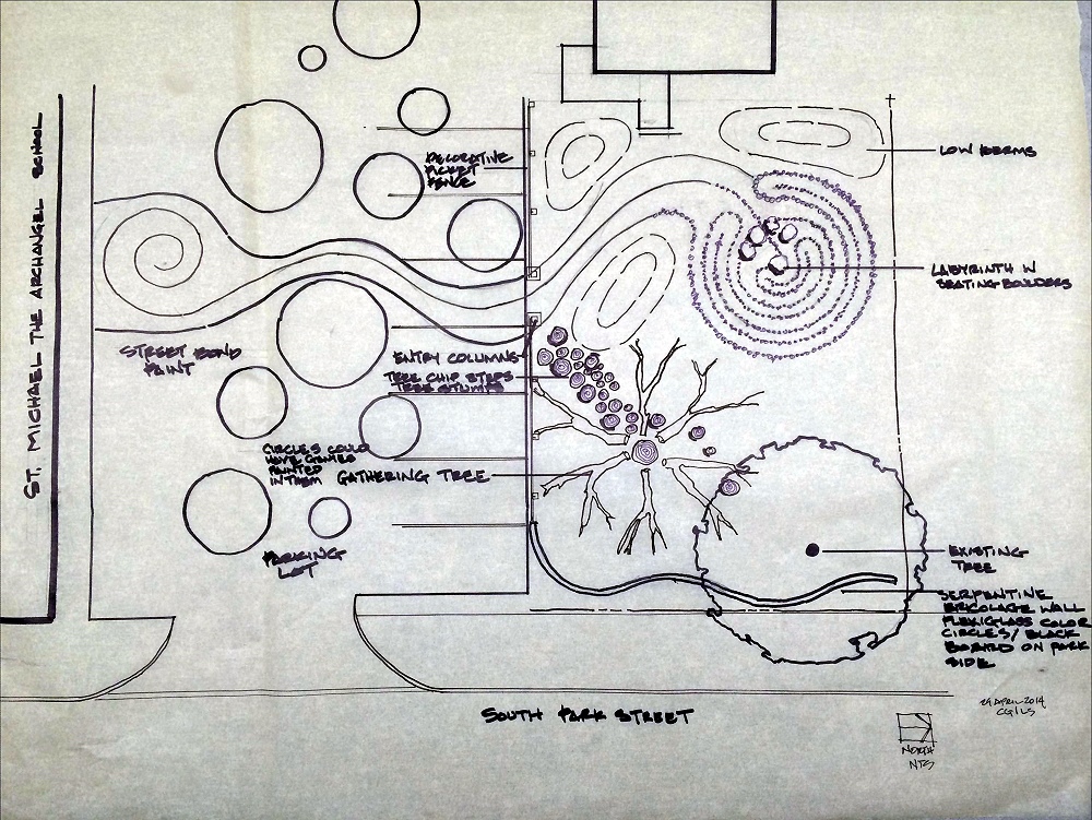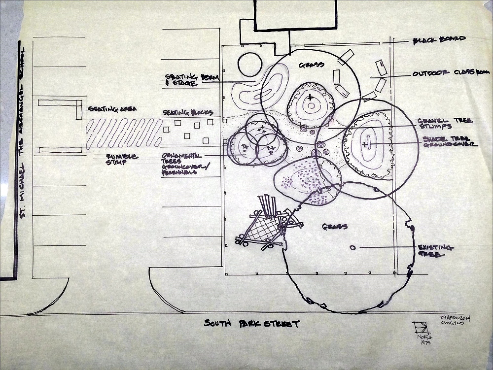 Working with the 6th and 8th grade computer and technology classes CG|LS taught the students about the design process and helped them explore ideas for developing the parking area and lot north of the school for play. Inspired by the students’ designs, the school and parents continue to work with CG|LS on an innovative new nature play park featuring the use of sticks, branches, scraps of lumber and other natural elements.